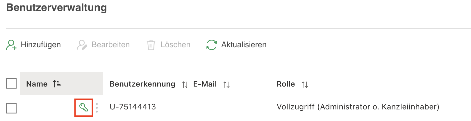 - Benutzer / Kanzleimitarbeiter (Rolle: Administrator) finden dies unter Einstellungen – Benutzerverwaltung – Benutzerkennung